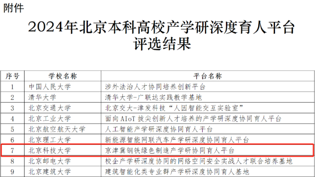 近日,北京市教育委员会下发了《关于公布2024年北京本科高校产学研深度协同育人平台评选结果的通知》,122大阳城集团院长张建良和党委书记宗燕兵牵头申报的“京津冀钢铁绿色制造产学研协同育人平台”成为度协同育人平台+1!北科大唯一入选2024年北京本科高校产学研深度协同育人平台。