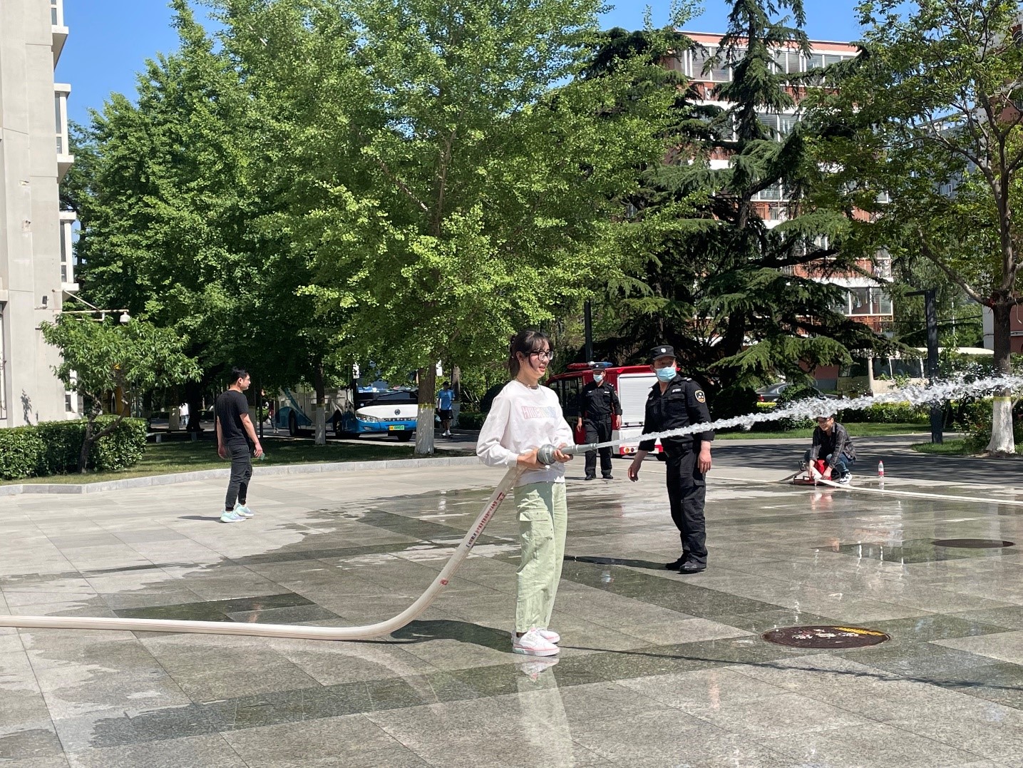 活动在学生公寓一斋西面广场举行,共有30余名师生参加了消防实操实训。实训主要分为三个步骤,大家首先认真聆听保卫处老师讲解操作,再两人一组完成接水带、开消火栓、喷水系列动作,最后逐一使用灭火器扑灭火苗,参训师生均需在规定时间内完成操作。