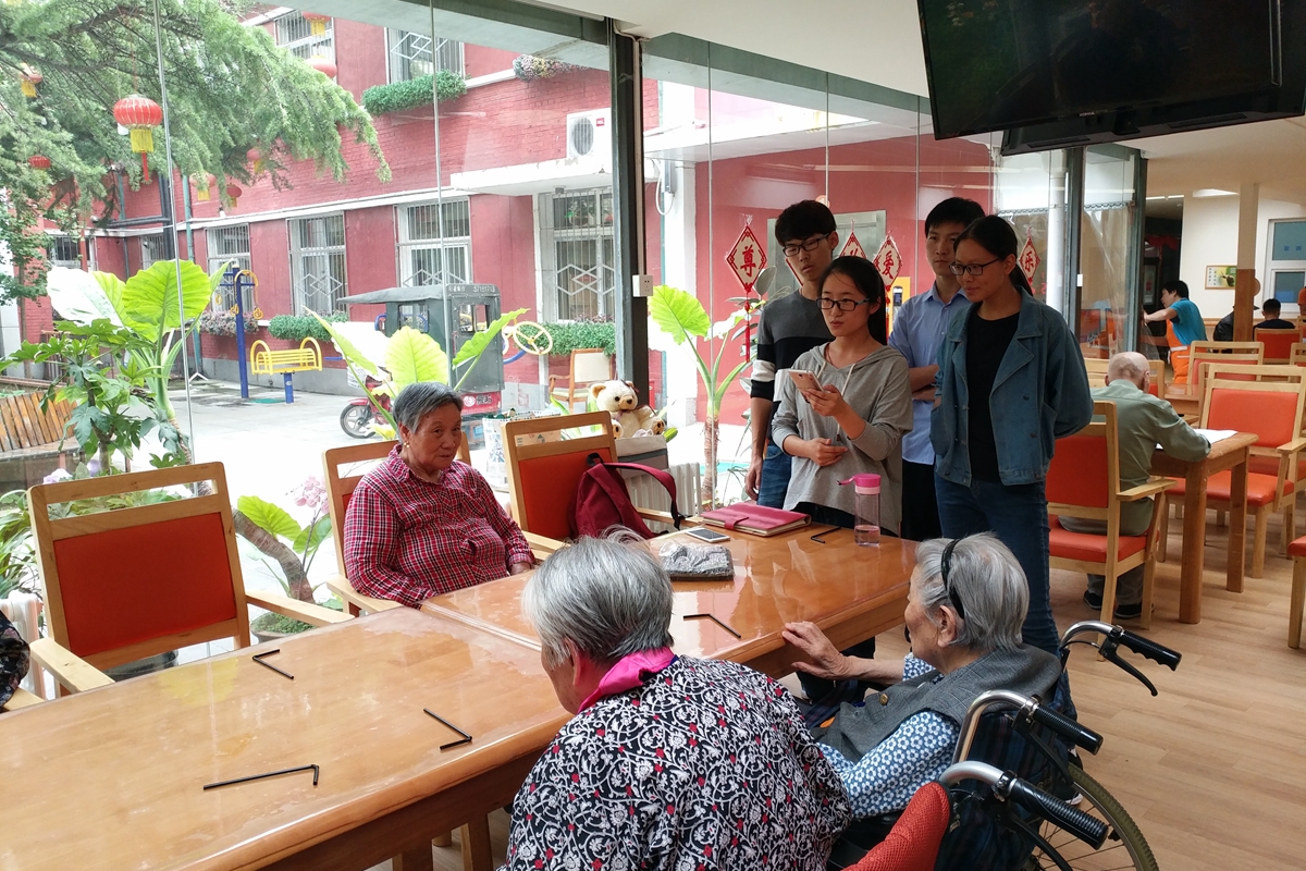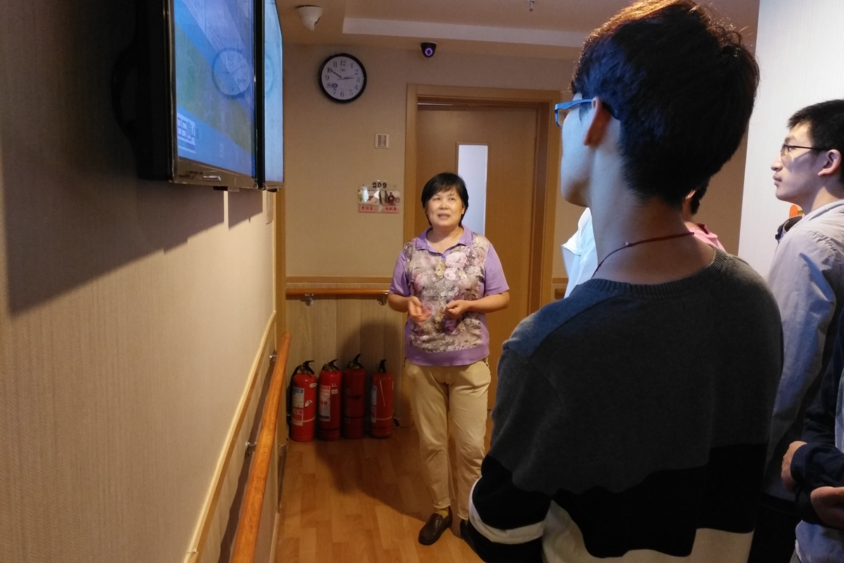 经过近一个小时的车程,服务队9名队员来到位于朝阳区和平家园的寸草春晖养老院。养老院主任首先带领着志愿者们参观了内部设施,老人的卧室、娱乐室、小花园整洁且温馨,营造出了一种家的温暖。自动监护系统可以24小时监控老人的心跳和血压。温馨的环境和先进的设备给生活在这里的老人带来极大的舒适和便利,也为老人们的健康安全提供了保障。