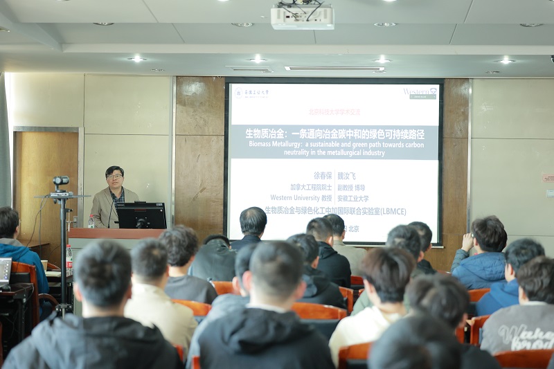 徐春保院士就生物质冶金做了主题作报告,他介绍了生物质冶金的概念和基本实现路径,综述了基于生物质能源与材料的冶金技术发展,并从生物质炭的制备、生物质基粘结剂合成技术、高炉喷吹生物质炭新技术、生物质铁矿球团新技术和电弧炉用生物质基发泡剂等五个方面论述了安徽工业大学生物质冶金与绿色化工中加国际联合实验室(LBMCE)近年来的研究进展。作完报告后,徐院士和在场师生就生物质炭的降碳、水热炭化的废水处理等问题展开了更加细致和深入的交流。