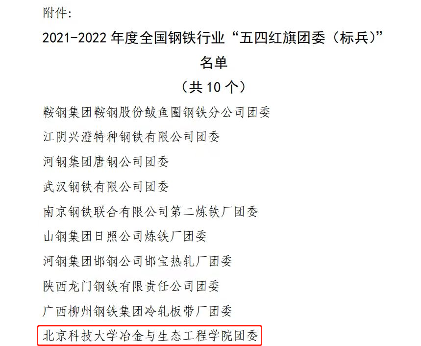 2023年5月25日,全国钢铁行业共青团工作指导和推进委员会二届六次常务会议、三届一次全会暨第36 次大钢团委书记联席会在122cc太阳成集团召开。大会评选和表彰了2021-2022年度全国钢铁行业共青团工作先进集体和个人,122大阳城集团团委荣获2021-2022年度全国钢铁行业“五四红旗团委(标兵)”荣誉称号。