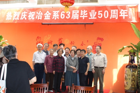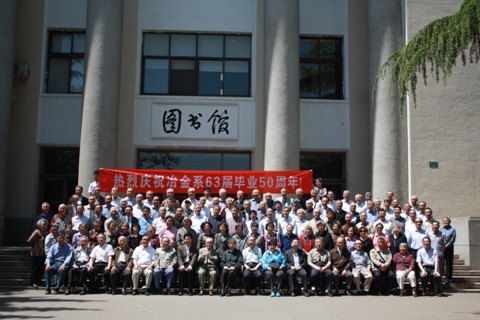 2013年5月11日,我院举行冶金系63届毕业生50周年聚会。来自全国各地的冶金系63届毕业生近120人欢聚一堂。我校校长张欣欣教授、副校长武德昆教授、原副校长戚以新教授、我院周国治院士、刘越生、孔令坛、王筱留、赵玉祥、关毓龙、马庭温、蔡开科等老一代冶金系前辈、老教授以及学院党委书记宋波教授、行政副院长耿小红、机械学院热能工程系冯俊小教授等多位教师欢聚一堂,参加了冶金系63届毕业50周年的聚会活动。