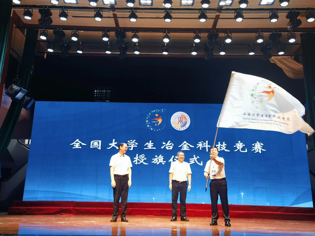 在会旗交接仪式上,江西理工大学副校长廖春发把大赛旗帜转交到中国金属学会秘书长王新江手中,再由王新江授予第八届大赛承办单位122cc太阳成集团,宗燕兵郑重接过了大赛旗帜。