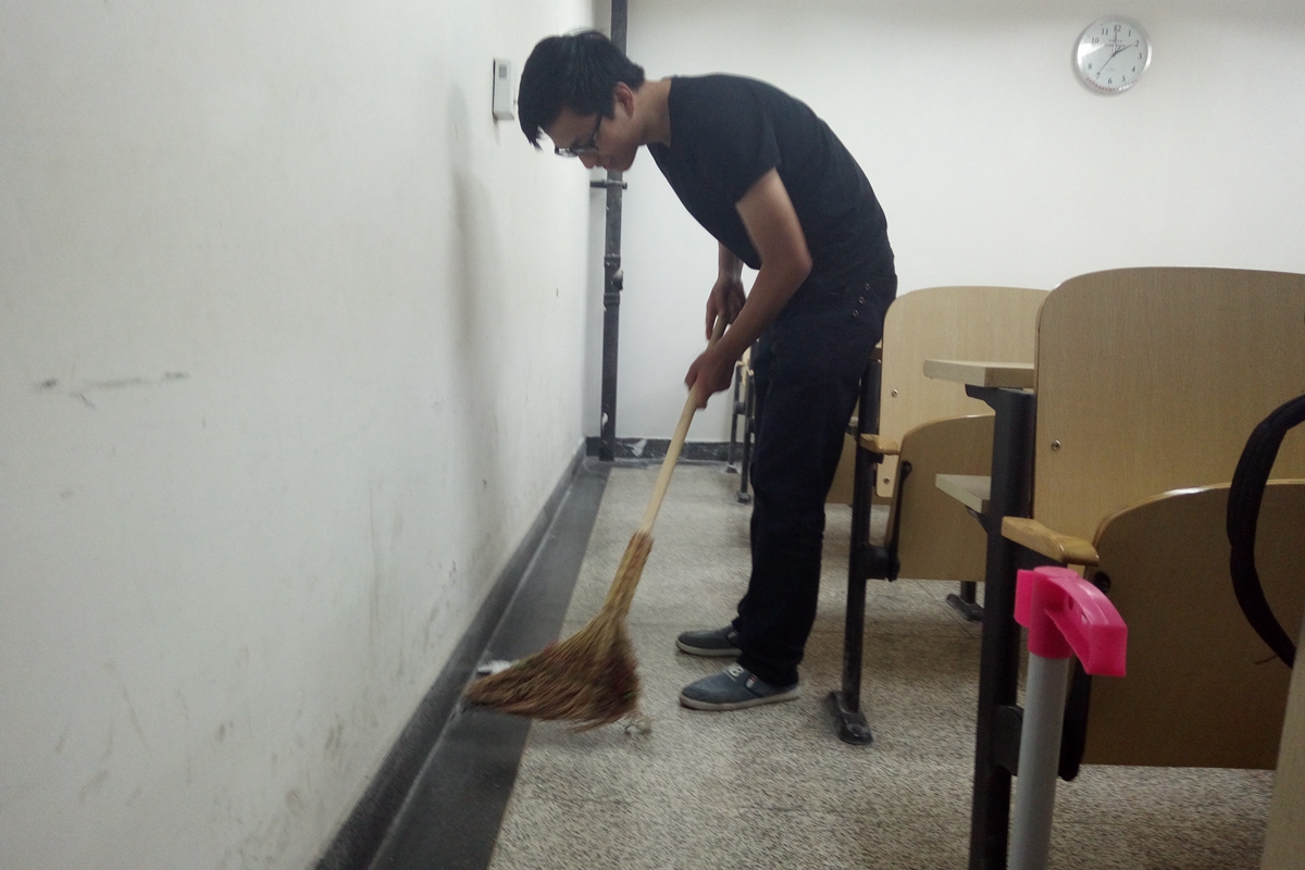 每个教室分别有同学负责扫拖地面,清洁窗台和桌椅。同学们们认真清扫。志愿活动有条不紊地进行,不到一个小时便完成了这四个教室的清扫和清洁。经过大家的积极工作,2点40分工作正式完成。大家清洁了打扫工具并放归原处,在冶金楼门前进行了合影。