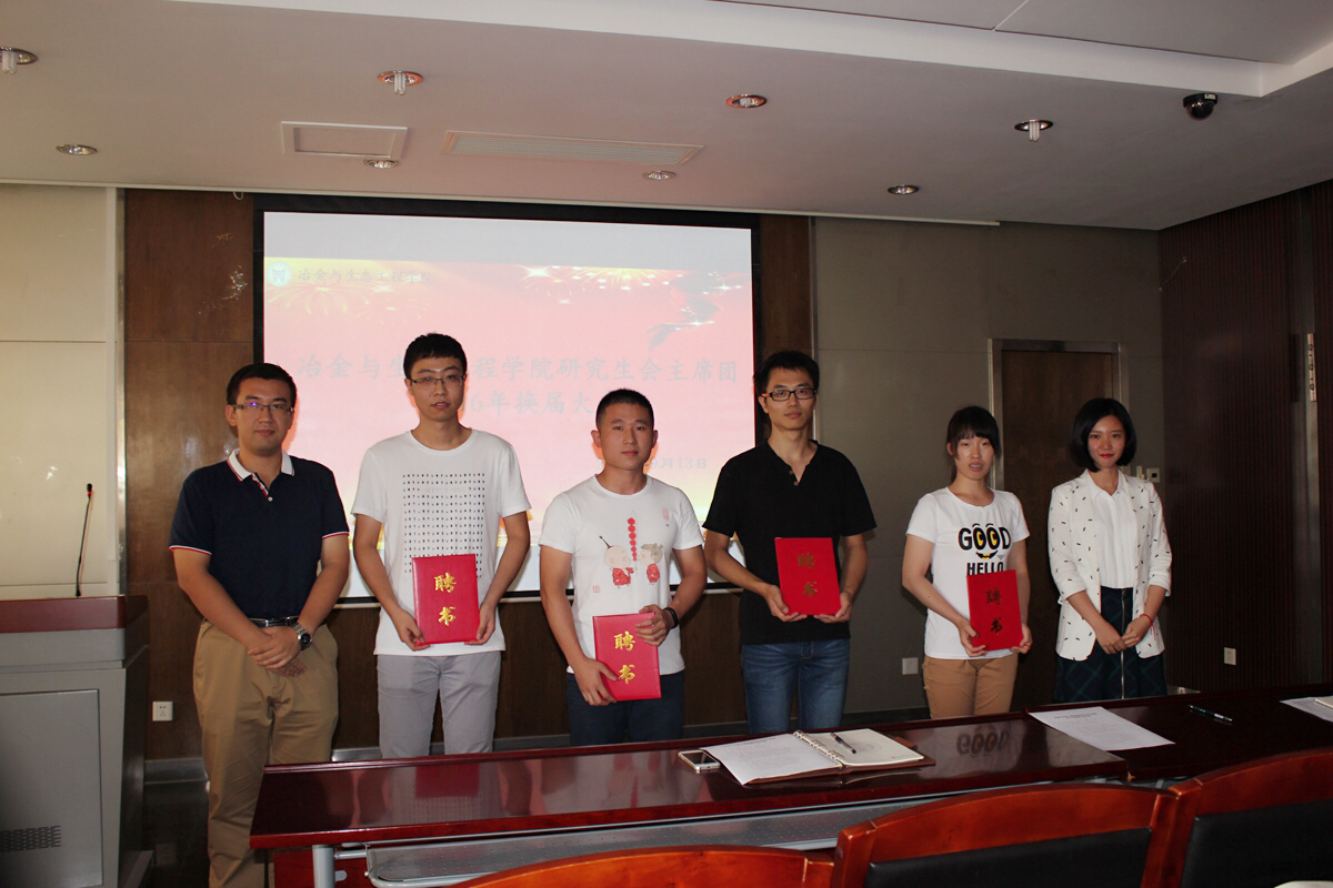 李元坤老师宣读了《122大阳城集团研究生会2016年主席团换届名单》。硕士2015级杨平、博士2015级陈威、博士2015级张剑、硕士2015级郝晓倩等四名新任主席团成员在掌声中走上前台,陈曦老师、李元坤老师为他们颁发聘书,表示祝贺。学院研究生会新任主席杨平同学代表新一届主席团发言。杨平同学表示,新一届主席团将秉承为同学们服务的宗旨,团结同学,共同努力建设具有品牌特色的冶金与生态学院研究生会。在未来的工作中加强联系,服务基层,共同营造多彩的冶研会大家庭,为同学们提供更加丰富的交流机会和广阔的展示平台。
