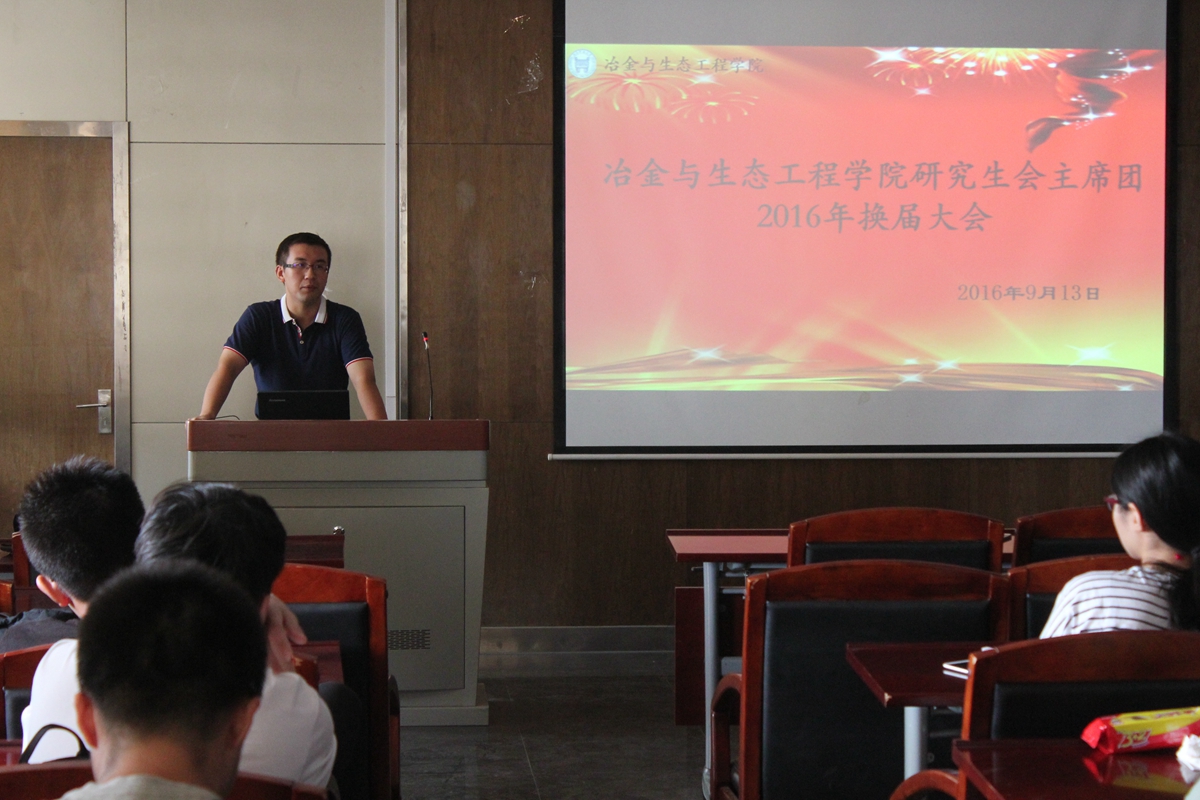 9月13日,122大阳城集团研究生会2016年换届大会在冶金生态楼青钢报告厅举行。学院研究生工作组组长、研究生辅导员陈曦老师,学院学生工作办公室主任、研究生辅导员李元坤老师出席,学院研究生会新任主席团成员、硕士2016级全体学生骨干参加。大会由新任副主席张剑同学主持。