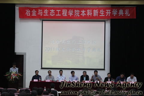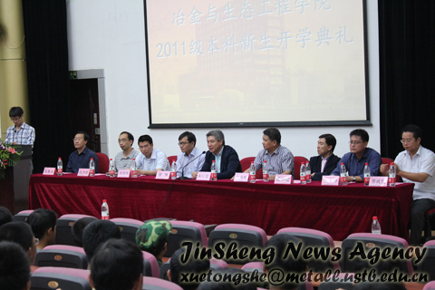 大会在雄壮的国歌声中拉开了序幕。朱鸿民院长首先为开学典礼致辞,向11届新同学表示热烈欢迎。朱院长告诉同学们:大学是人生的一个转折点,发展空间宽广,要珍惜时间好好学习。同时他也认为学生们应对自己的专业感到自豪,并希望几十年后同学们能给学校带来更大的荣誉。他要求新一届冶金学子树立远大理想,并从小事做起,做好每一件小事。