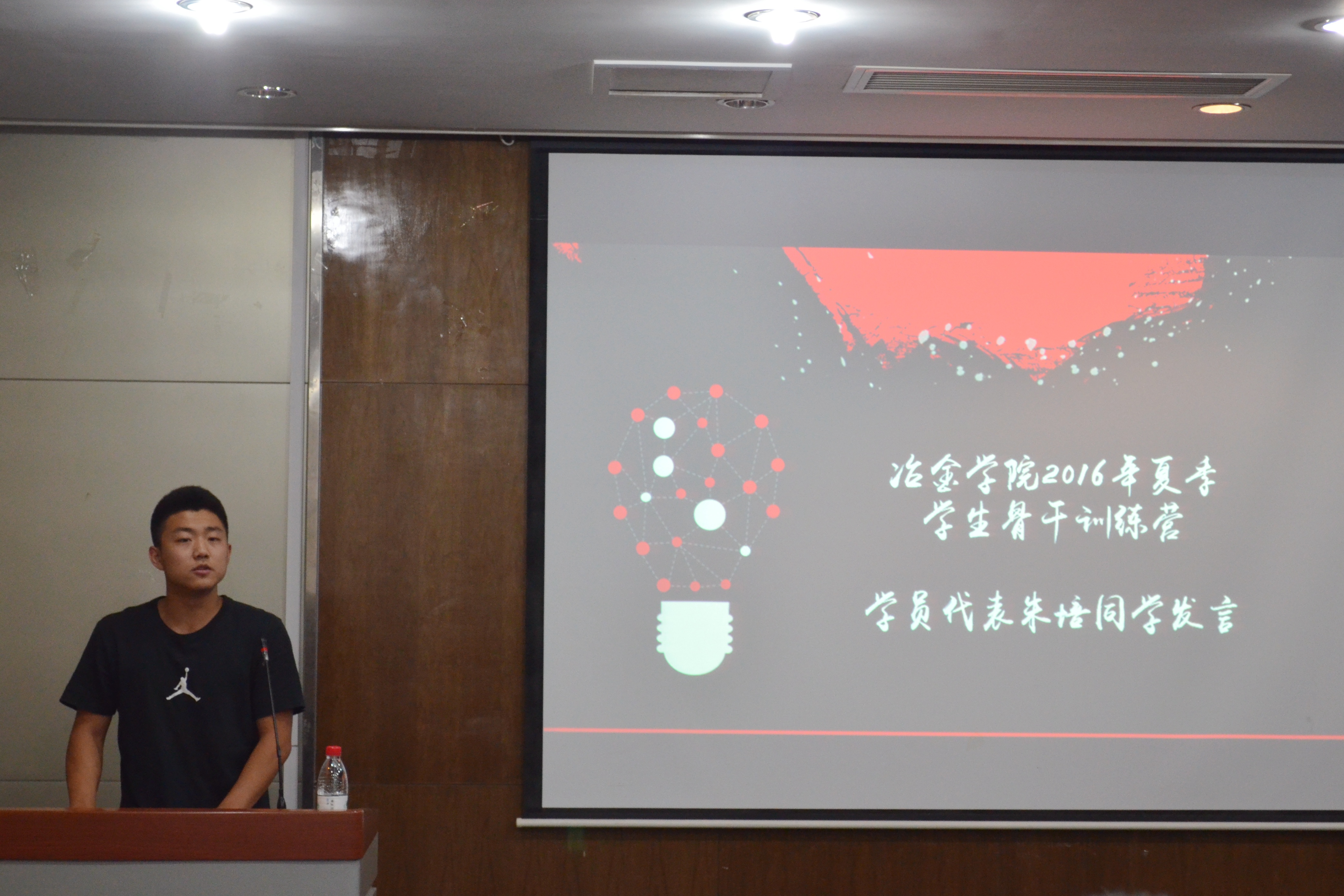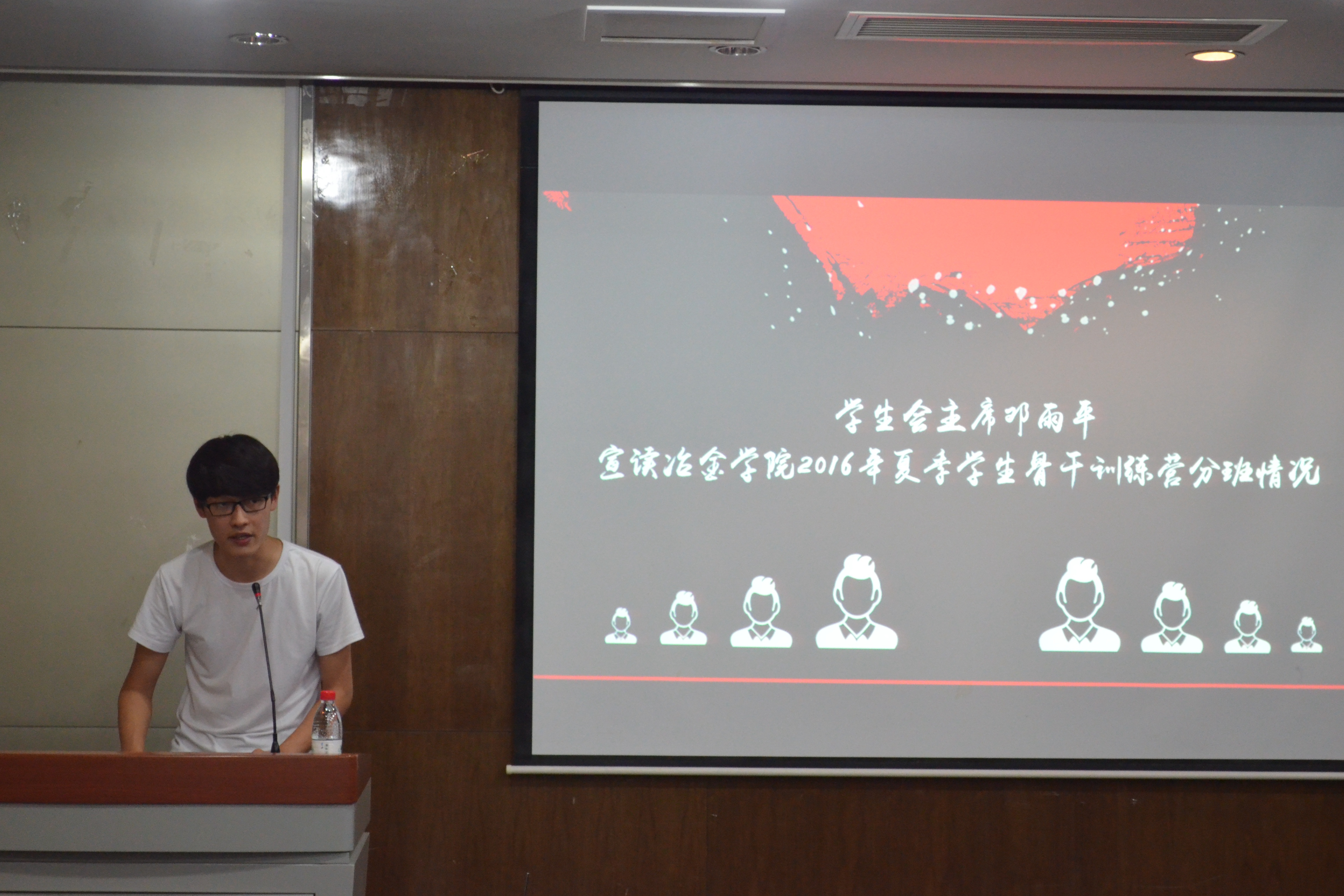 开班典礼上,院团委书记杨志伟老师宣读了有关122大阳城集团2016年夏季学生骨干训练营的通知并介绍了训练营的相关情况,随后学生会主席邓雨平同学宣读了122大阳城集团2016年夏季学生骨干训练营须知及分班情况。接下来,学员代表朱培同学代表全体学员进行发言。