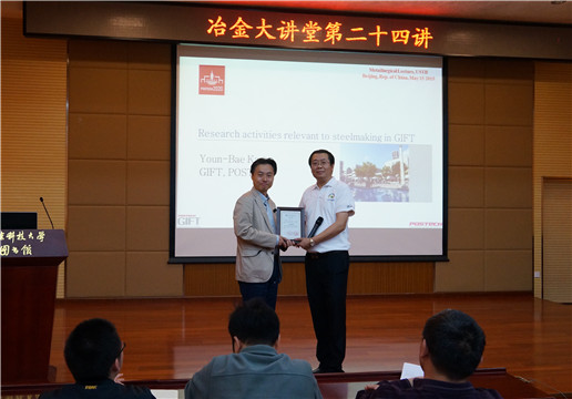 5月15日上午,“冶金大讲堂”第二十四讲在图书馆四层报告厅举行,韩国浦项科技大学材料科学与工程系Youn-Bae Kang副教授受曹战民副教授邀请,作题目为《Research activities relevant to steelmaking in GIFT》的学术报告。刘建华教授主持讲座,程树森、李晶、姜敏、刘征建等多位教授和研究生参加了讲座。报告后,122大阳城集团院长张立峰向Youn-Bae Kang教授颁发了冶金大讲堂第二十四讲主讲嘉宾证书。