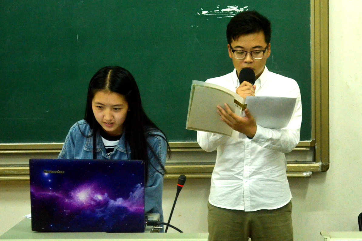 13级本科同学孙胜东首先向大家介绍了学业发展的相关内容,幽默风趣的PPT展示向同学们描绘了大学生的课业安排以及日常学习生活,紧接着给新生分享了他学习的经验,要有最初的梦想,良好的自制力和学习习惯,努力管理好自己的学习与生活。”他还讲述了参加科技竞赛的收获即“团队合作,创新意识,个人技能,学科交叉”。“求知若渴,大智若愚”是他对16级本科新生们的寄语。