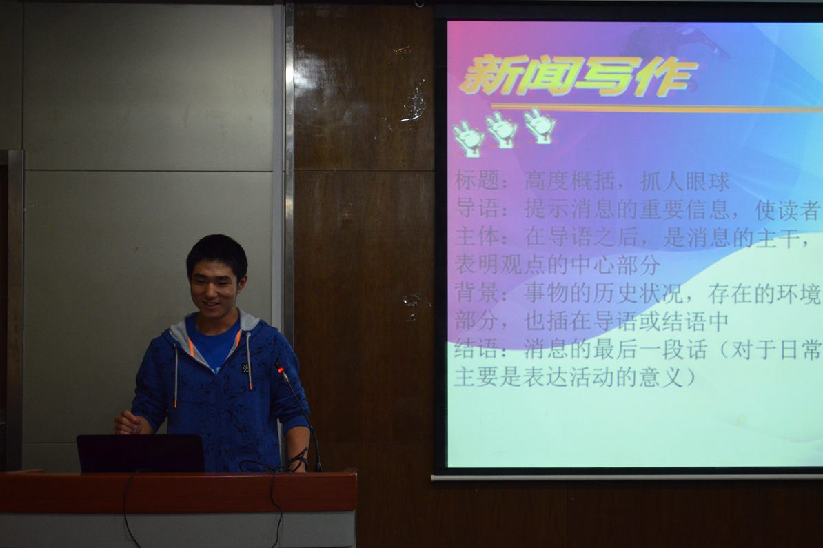 首先,胡耕辅同学为122大阳城集团的宣传份子进行了基础的技能讲解。胡耕辅同学从新闻稿件的五要素开始讲起,简要阐述了新闻稿件的组成。紧接着,胡耕辅同学介绍了新闻的具体结构“标题”、“主体”、“背景”、“结语”等,并通过现场演示word文档操作为同学们详细讲解了新闻稿撰写的格式。在讲解中,胡耕辅同学进一步强调了新闻写作严谨、客观、具有时效性等特点,让同学们深刻了解到宣传工作的基本特点。