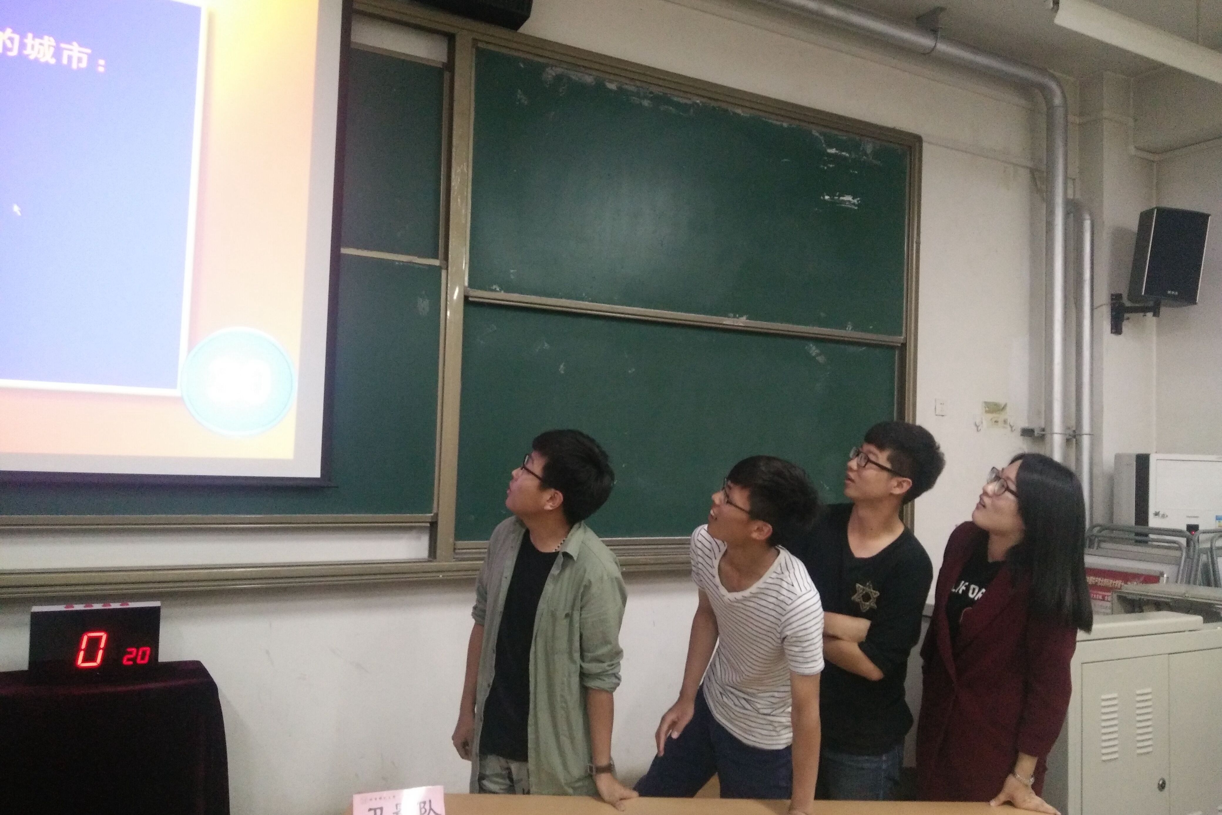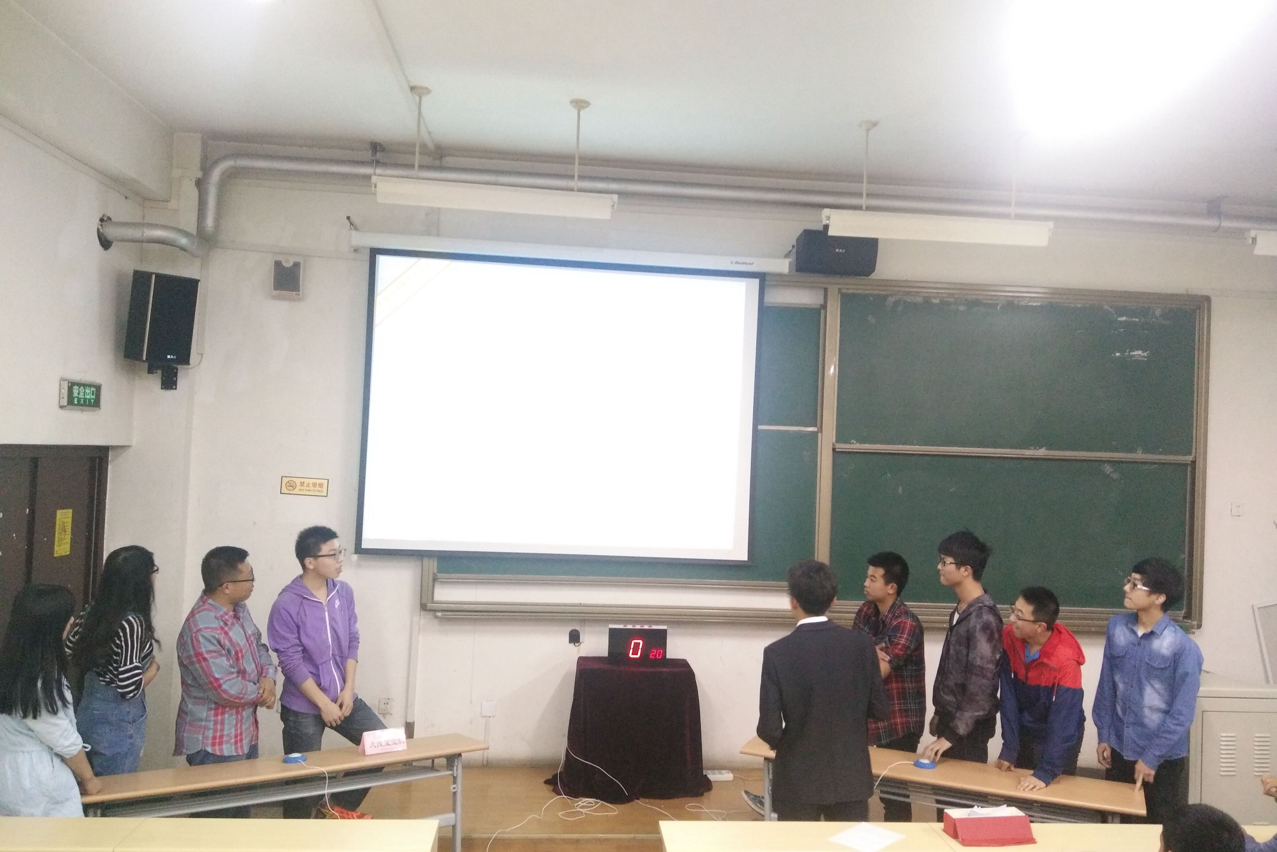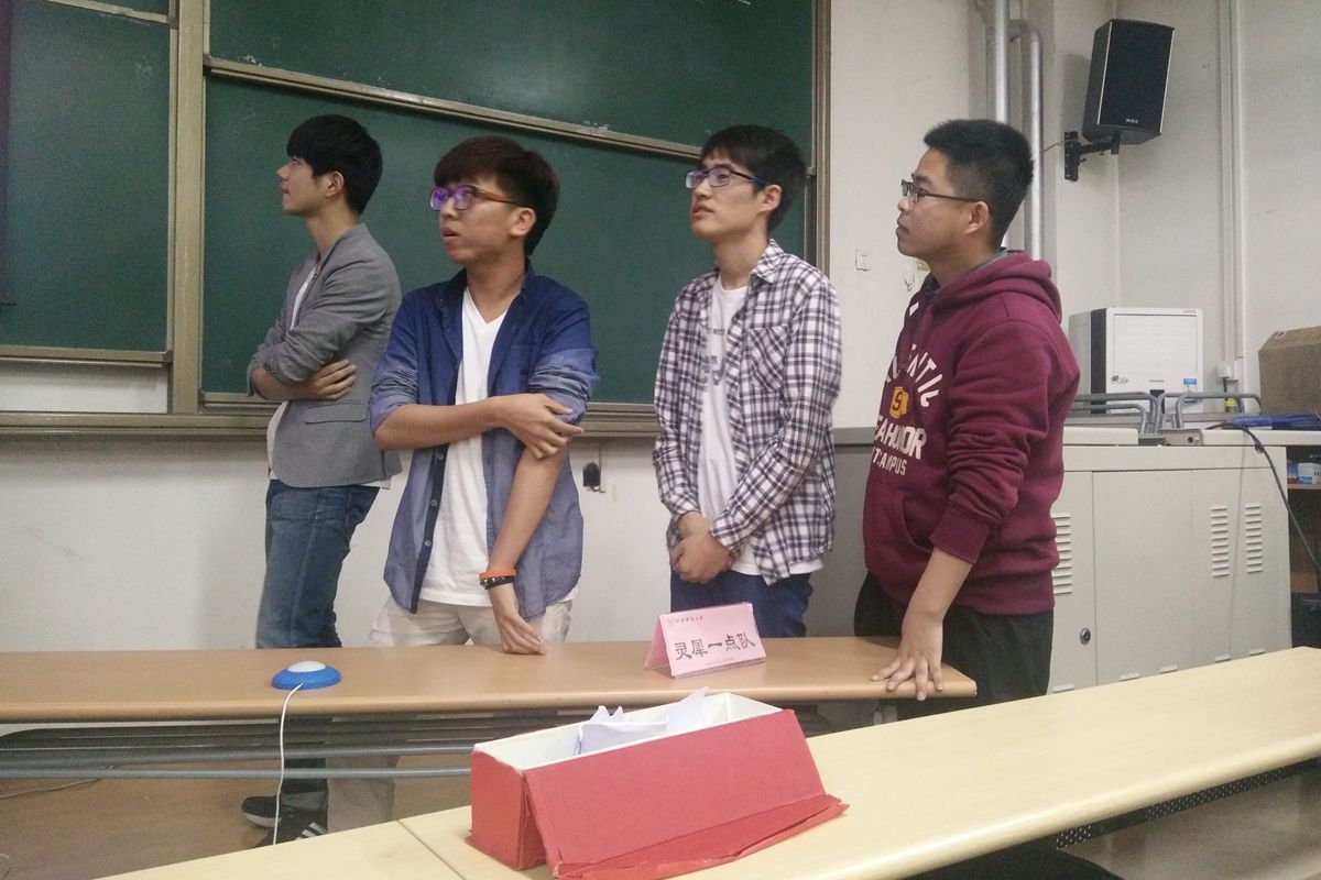 竞赛第一个环节是“谁与争锋”―对战的两只队伍分别派出一名队员上场,对方选定某个板块的题目,由本方人员作答,在规定时间内答题不完整、答错题等视为失败。双方轮流为对方选题,轮流作答,当双方人员出现一方答对而另一方答错的情况,答错方淘汰本名队员,换上另一名队员,直到一方队伍的四名队员全被淘汰,比赛终止,另一方为获胜方。第一组是1304班天线宝宝队对战1305班杀死宝宝队;第二组是1301班卫冕队对战1506班第六感队;第三组是1401班“一看就队”对战1407班灵犀一点队。比赛过程中,选手们仔细思考,尽量为自己的团队争取胜利。台下观众也同选手们一起思考着,竞赛的氛围极为浓厚。