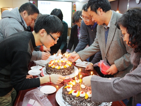 2012年是龙年,活动伊始学院工会特地为属龙的教师们准备了精美的礼品,订制了美味的生日蛋糕,由工会主席王新东老师宣读寿星名单。在“祝你生日快乐”的乐曲中,属龙的老师们许下心愿,吹灭蜡烛,与在场的所有老师们分享了生日大蛋糕。