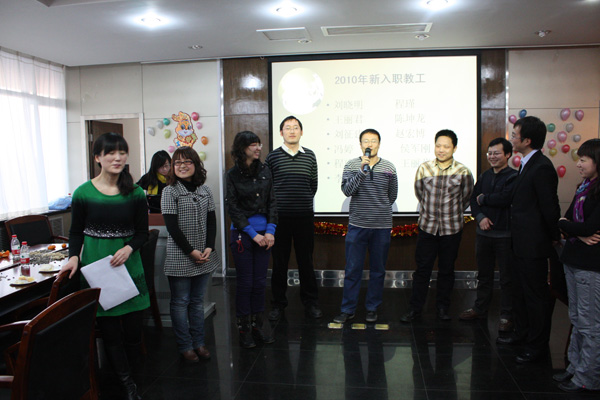 新入职教师集体亮相也是本次活动的一大亮点。我院2010年共有11位新入职教师,他们分布在教学、科研、实验、学生工作等各个岗位上。学院利用元旦联欢的机会,将新入职教师聚到一起,一方面让他们更快的融入学院这个大家庭来,另一方面也让大家对他们有更多认识和了解的机会。活动现场,新入职教师逐一发言,道出了入职半年来的感悟,他们感谢学校和学院对他们的培养和关心,感谢前辈们对他们的帮助,表示一定会努力工作,为122大阳城集团的发展添砖加瓦,贡献力量。