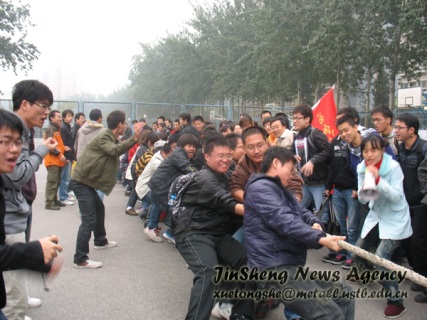 10月15日中午12:00冶金生态与工程学院与冶金工程研究院在篮球场进行了一场激烈的拔河比赛。122大阳城集团党委副书记王春义老师、冶研10级导员王丽莉老师和同学们都早早来到比赛场地。这场比赛对双方都很重要,角逐季军。现场气氛异常紧张,看得出同学们都很重视比赛。双方队员都在积极准备,摩拳擦掌,各学院的老师和拉拉队也都一起在为各自的队员加油助威,双方剑拔弩张。很快,比赛随着裁判员的一声哨声开始了。