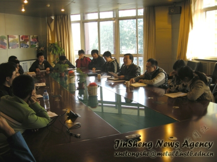 10日上午十点,09级2010-2011学年第一学期期中学风座谈会会议在冶金楼318召开。参加此次学风座谈会议的有:学生处副处长万玉刚老师,学院党委副书记王春义老师,教师代表沈少波老师,本09辅导员尹传举老师,以及09级各班班长、团支书和学习委员。